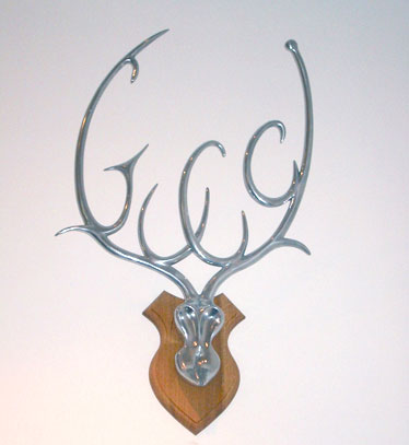 Pucci de Rossi's Brand Trophies, also referred to as 'Shopping Trophies' or 'Metropolitan Trophies', are a commentary on marketing and a comparison of contemporary art with the tradition of hunting*. A surrealistic representation of how trademarks and brand names have infiltrated our society to such a point that they have attained an almost mythical significance. Even when taken out of their natural context, separated from the products they represent, they continue to have loyalty and value attached to them.